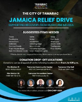 Tamarac, Fla. –The City of Tamarac is launching a Jamaica Relief Drive to provide aid to communities impacted by Hurricane Melissa. Residents are encouraged to donate essential items to help families and neighborhoods recover from the storm’s devastation.
