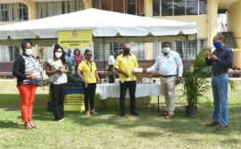 Regional Director for the Southern Regional Health Authority (SRHA), Michael Bent (2nd right) accepts a commitment letter from General Manager of Jamaica Standard Products Company Ltd. John O. Minott (3rd right) for the donation of 6, 000 units of coffee to be distributed to some 6,000 healthcare workers island-wide, valued at $365,000.00. Mr. Bent expressed appreciation to Mr. Minott and his company, located in Manchester, for their generous donation of coffee products, which will boost staff members who are working tirelessly during this pandemic. Mr. Minott noted that his company is pleased to show gratitude to the country’s frontline workers who are helping to care for Jamaicans. Participating in the handover on Friday, May 8 were: SRHA Board Chairman, Wayne Chen (right), Director of Public Procurement at the SRHA, Stacey-Ann Edwards (left), SRHA Director of Human Resource Management and Industrial Relations, Nicolette Thomas Edwards (2nd left) and Marketing Executive at the Jamaica Standard Products Company, Sarah Myers.