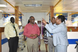Acting CEO of the Mandeville Regional Hospital in Manchester, Marcia Francis (right) informs newly appointed Custos Rotolorum for Manchester, Garfield Green (centre) of the services offered at the hospital. Mr. Green, who is a businessman, toured several health facilities in Manchester including hospitals and health centres on Wednesday, July 17. The Custos pledged his support to the health sector in the parish, noting that he is looking forward to forging a strong partnership with the Southern Regional Health Authority (SRHA), in an effort to improve the health services in the parish. Mr. Green will be installed on August 29. Photographed also is Regional Director of the SRHA, Michael Bent (2nd right) and Director of Management Information Systems, Rohan Smith (left).