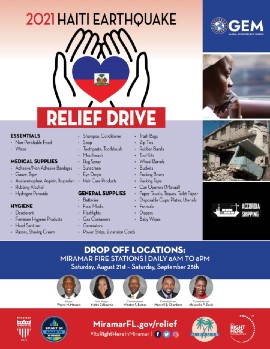 MIRAMAR, FL - The City of Miramar announced today that they will be holding a community donation drive that will benefit the residents of Haiti who have been impacted by the 7.2 magnitude earthquake which struck the country on Saturday, August 14, 2021. Officials of that country have expressed their need for assistance including items such as medical supplies, hygiene products and other general supplies to displaced citizens.