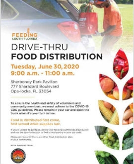 OPA-LOCKA, Fl. — The City of Opa-locka and Feeding South Florida continue their active roles in providing support to the City of Opa-Locka community through drive-thru food distributions. The City of Opa-locka and Feeding South Florida hosted a drive-thru food distribution today, Tuesday, June 29, 2020, from 9:00 a.m. to 11:00 a.m. at Sherbondy Park Pavilion, 777 Sharazard Boulevard, Opa-locka.