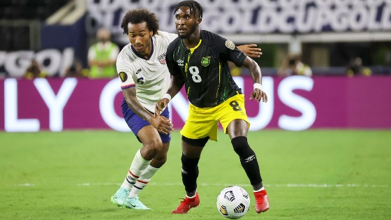 Michail Antonio (#18) celebrates with a teammate after scoring for Jamaica recently.
