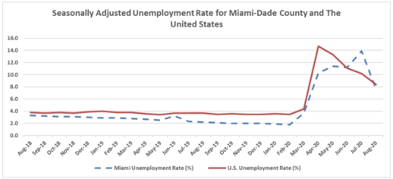 Miami, FL - During August 2020, the not seasonally adjusted unemployment rate in Miami-Dade County was 8 percent. From August 2019 to August 2020, the County had a reduction of 75,800 nonagricultural payroll jobs (not seasonally adjusted), which indicate a 6.2 percentage point decrease. From July 2020 to August 2020, there was an increase of 16,000, which reflects a 1.4 percent increase of nonagricultural payroll jobs.