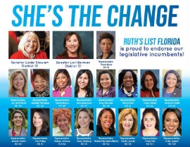 Tampa- Ruth’s List Florida announced today 19 endorsements for pro-choice Democratic candidates seeking re-election. “Ruth’s List is proud to lend its sought after “seal of approval” to an incredible group of pro-choice Democratic women seeking re-election to state legislative offices. These legislators are the front-line fighters on issues that matter most to Florida families: womens reproductive choice, health care, education and protecting Florida’s environment. Our endorsed legislators are essential to turning back the clock on 20 years of Republican rule in Tallahassee.” Said Pamela Goodman, CEO/President of RLF. “Each of these women is a leader and trailblazer in her own right. Individually, they are changing their communities. Collectively, they are changing our state and our nation.”
